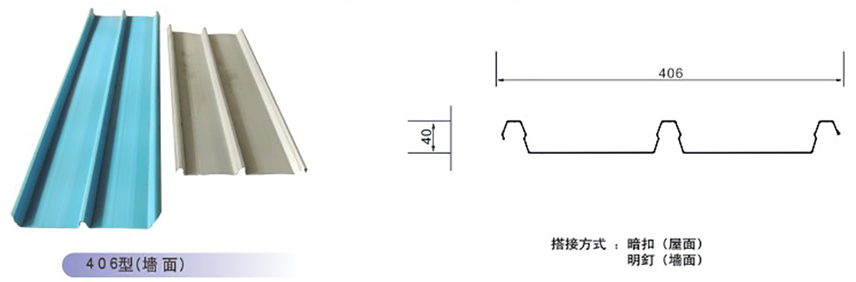 406型彩色压型板,用于墙面,因波峰高达40MM,有效种盖宽度大,用于墙面外板经济美观。